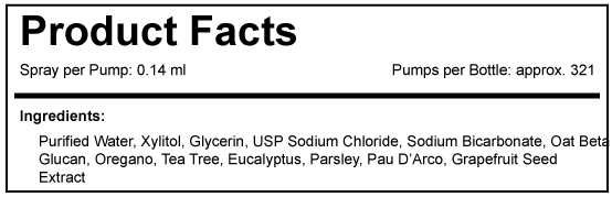 Purified Water, Xylitol, Glycerin, USP Sodium Chloride, Sodium Bicarbonate, Oat Beta Glucan, Oregano, Tea Tree, Eucalyptus, Parsley, Pau D’Arco, Grapefruit Seed Extract
